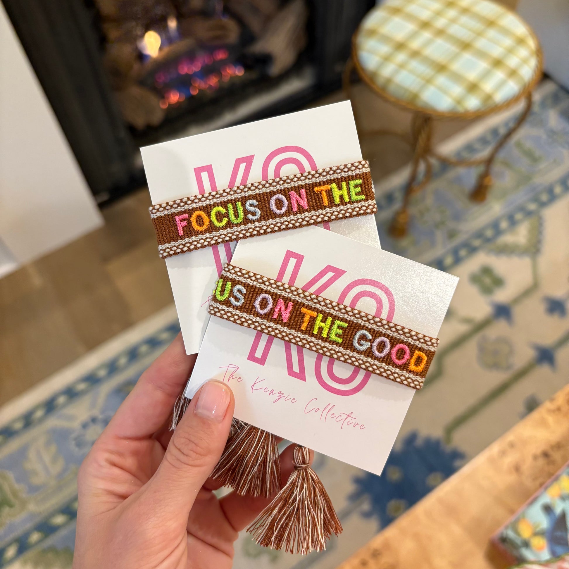 This chocolate brown embroidered bracelet reads āfocus on the goodā in colorful letters ... the perfect mix of happy and fall-ready.