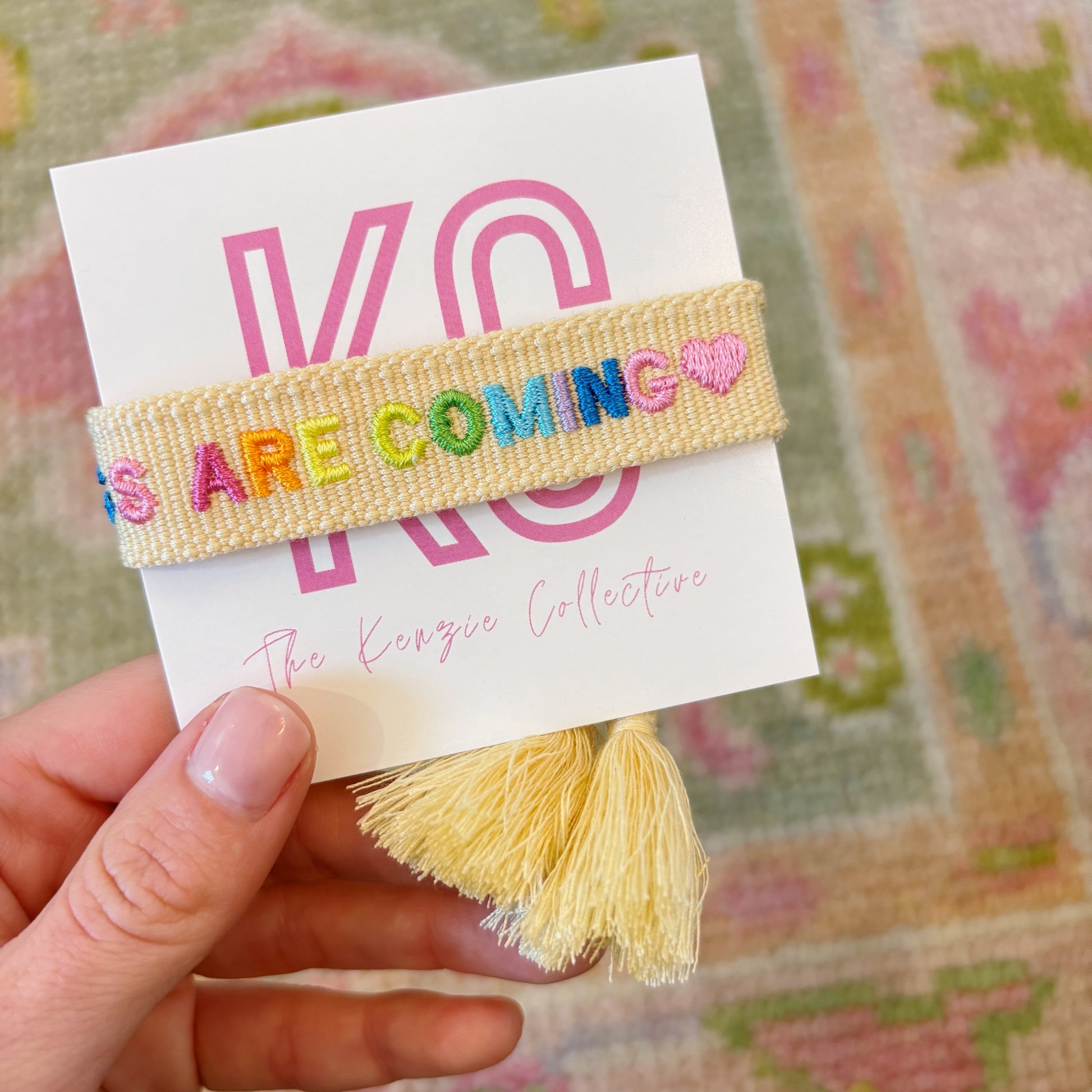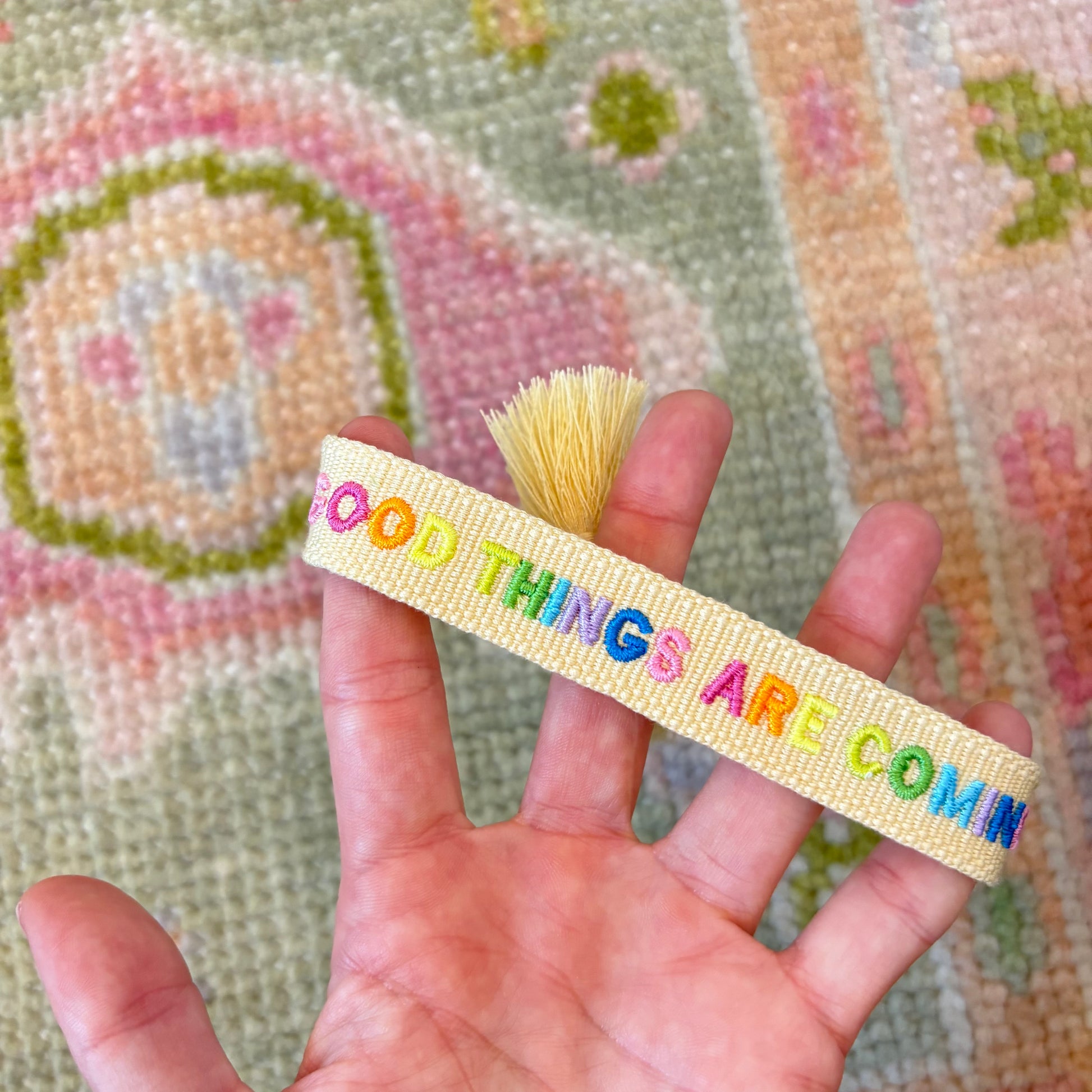This soft butter-yellow embroidered bracelet reads “good things are coming” in colorful letters ...the perfect dose of optimism and color for your everyday stack.