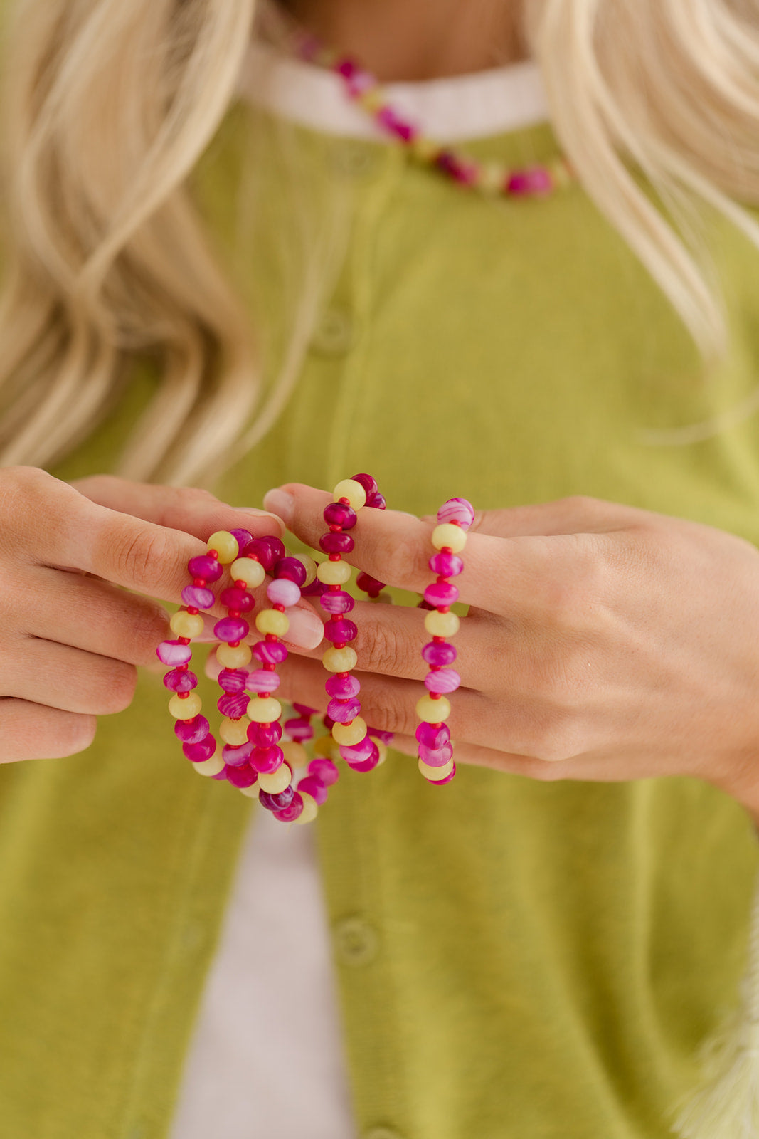 Meet your new everyday-meets-holiday staple. This stretchy, one-size-fits-all bracelet is handmade in Nashville with a mix of pink, red, and chartreuse stones. Easy to slip on, comfortable to wear all day, and festive enough to take you straight into the holiday season