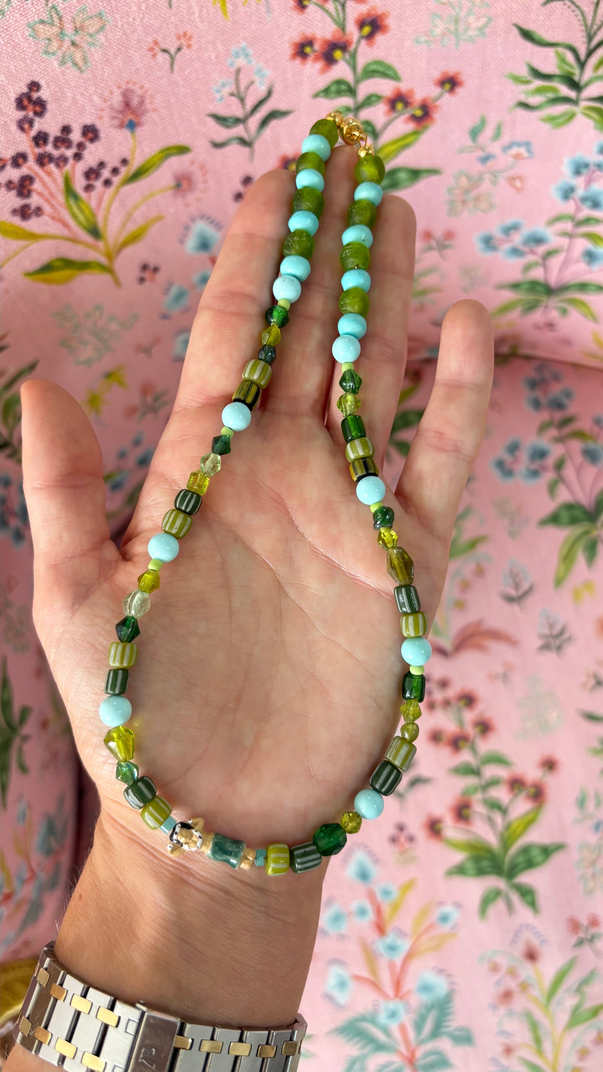 Handmade with a mix of green glass beads in the most beautiful range of shades, finished with a hand-sculpted hula girl bead. One of 7 necklaces made.