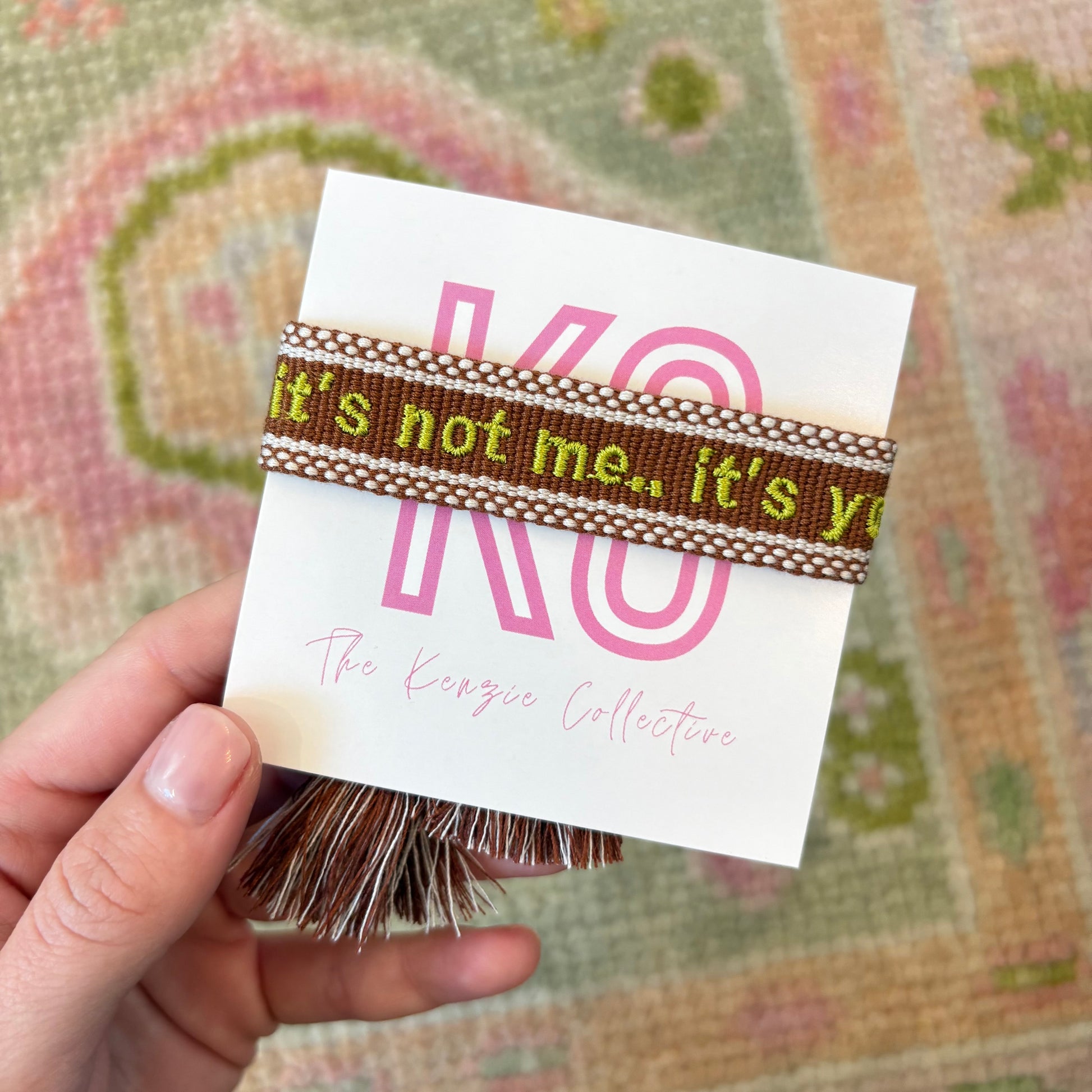 our brown tassel bracelet is embroidered with green letters that spell “It’s not me it’s you.” It’s fully adjustable, easy to slip on and off, and the perfect mix of snark and style.