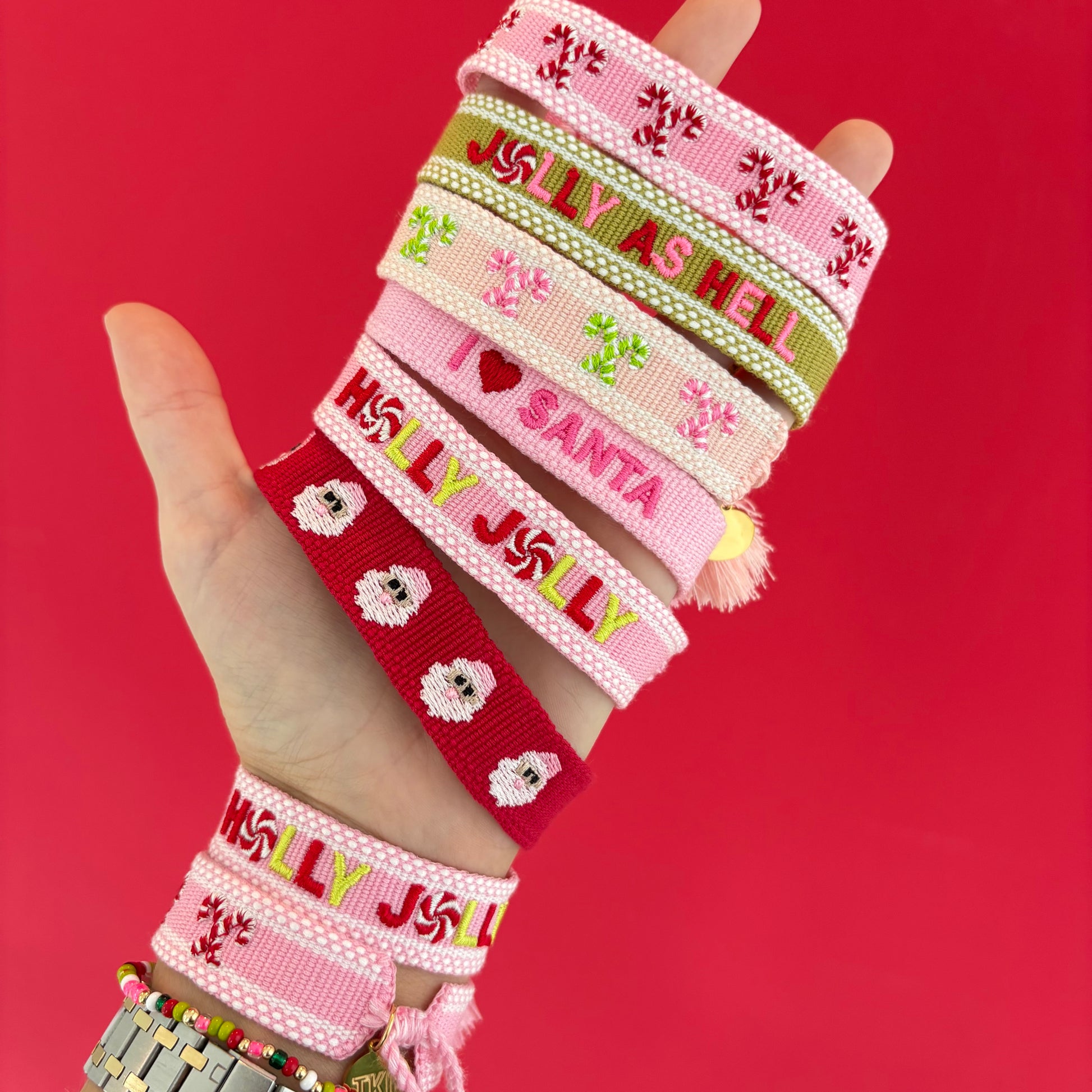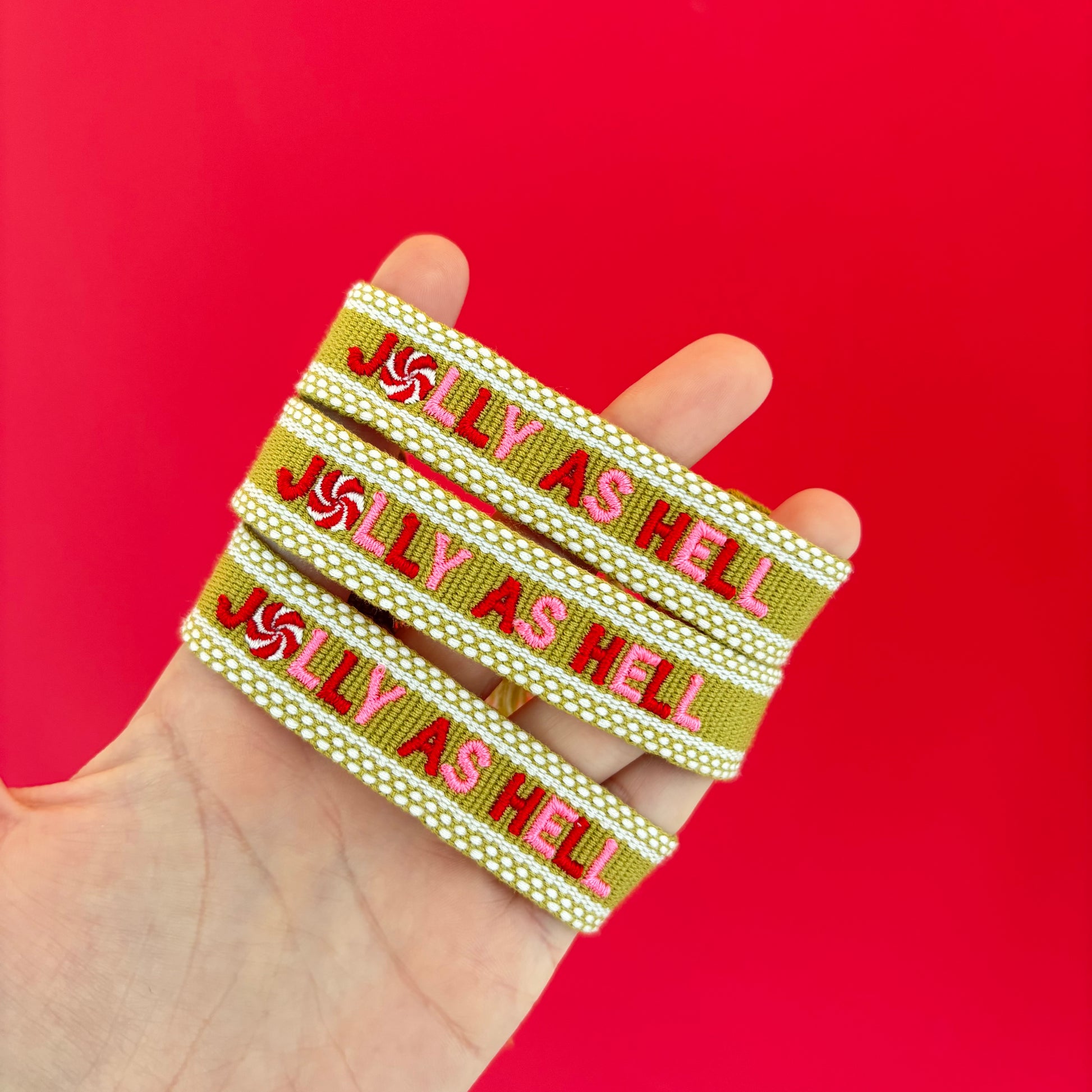 This chartreuse embroidered tassel bracelet brings the perfect mix of holiday cheer and attitude. JOLLY AS HELL is embroidered bold festive lettering - because “holly jolly” just doesn’t hit the same.