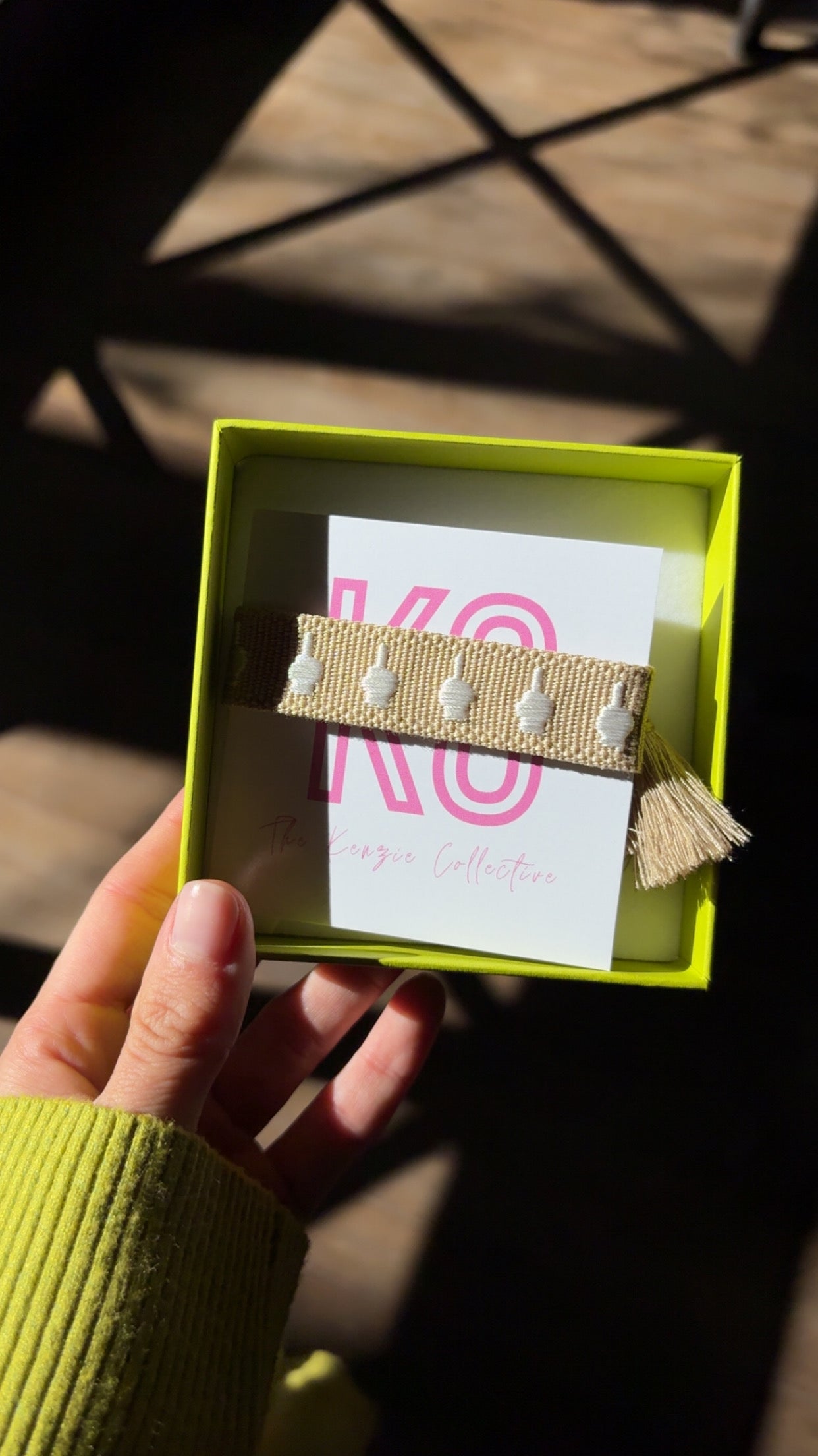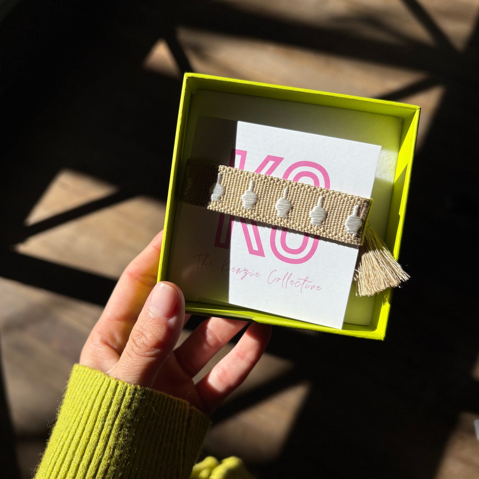 What the bracelet says!! This tan and white embroidered tassel bracelet features tiny middle fingers stitched all the way around … a subtle statement for the days you’re smiling through the chaos. Chic enough to stack, bold enough to stand alone.