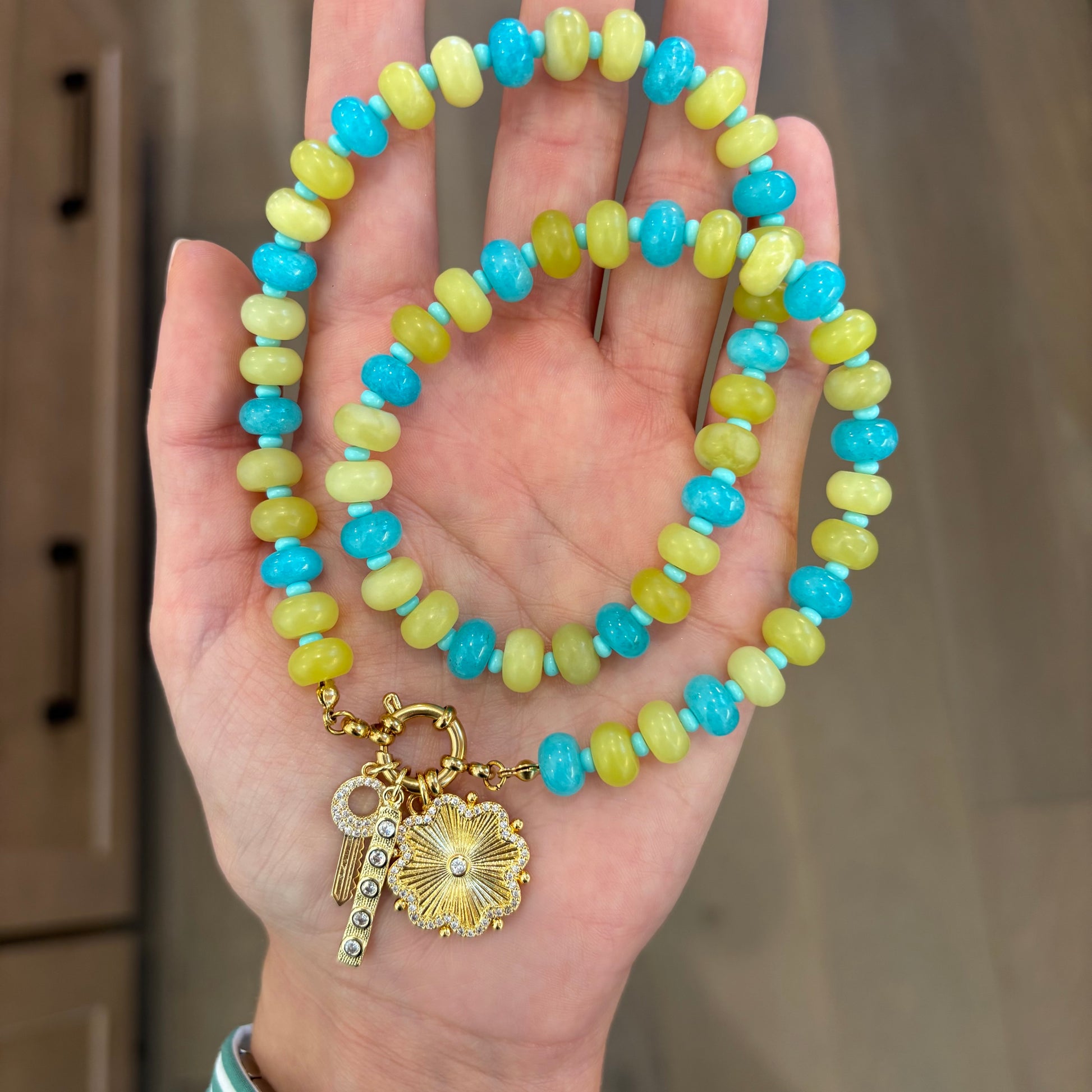 This necklace is handmade with chartreuse and blue stones with tiny blue beads hand placed in between each — the perfect necklace, so easy to throw on and go! It has a spring ring clasp so you can swap out or remove the charms anytime you want (no tools needed)