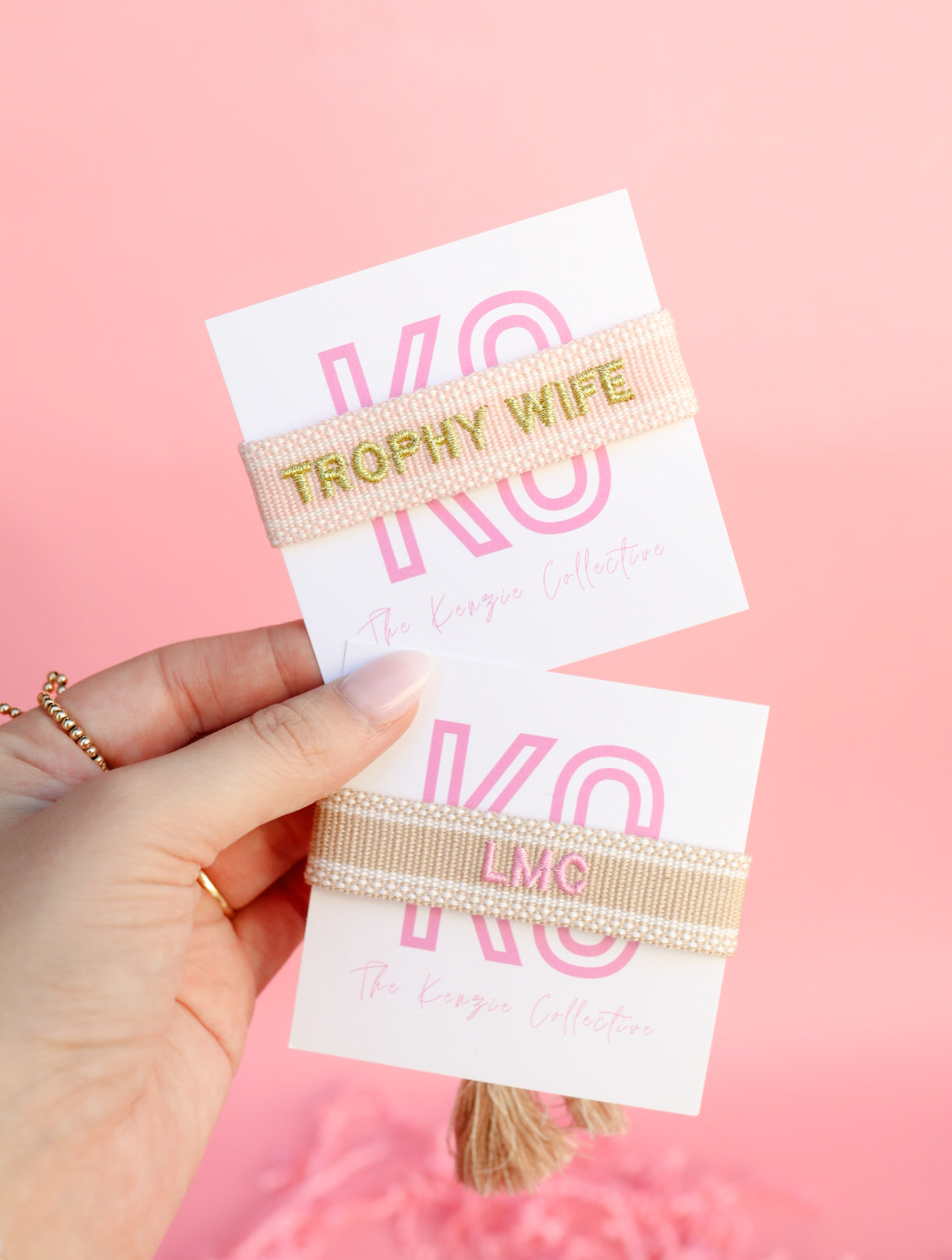 trophy wife bracelet, metallic gold tassel bracelet, funny friendship bracelet, statement bracelet gold letters, adjustable tassel bracelet